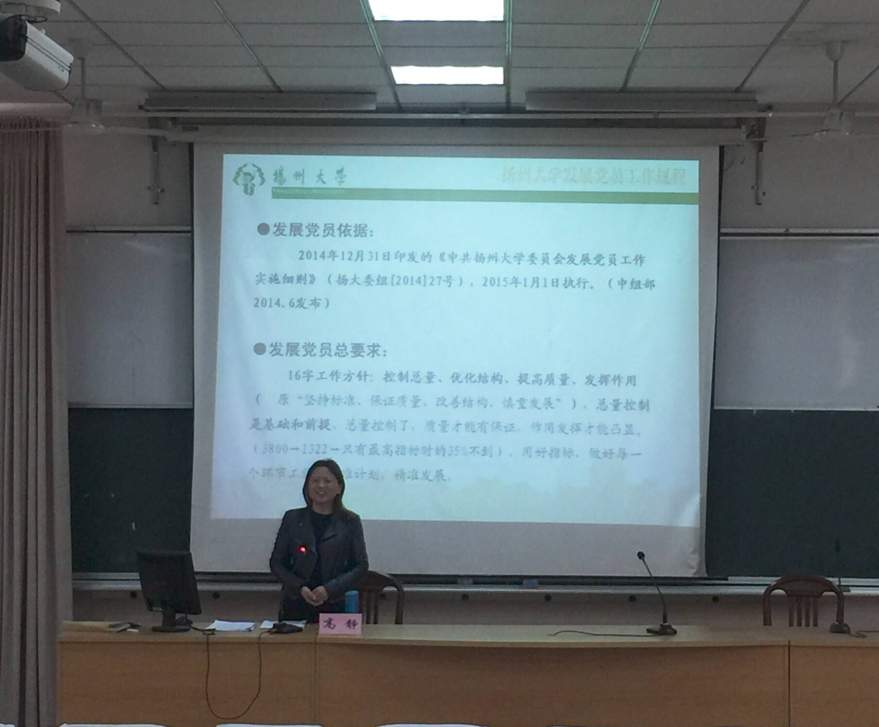 高静为培训班学员讲解了党员发展工作规程,对发展各阶段的基本原则、工作要求和重点作了详细阐述。随后,院团委书记许金鑫和组织员卢炜分别就班主任工作制度和要求,以及党员发展材料的撰写归档等作了专题解读。