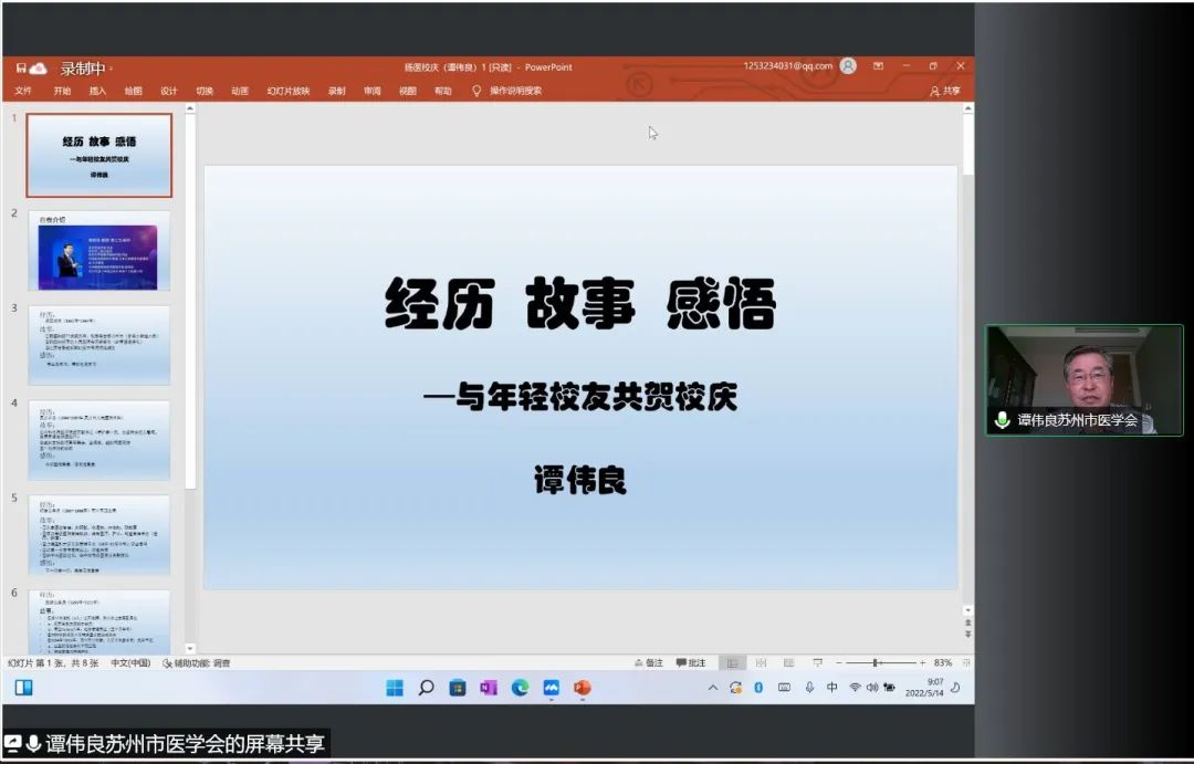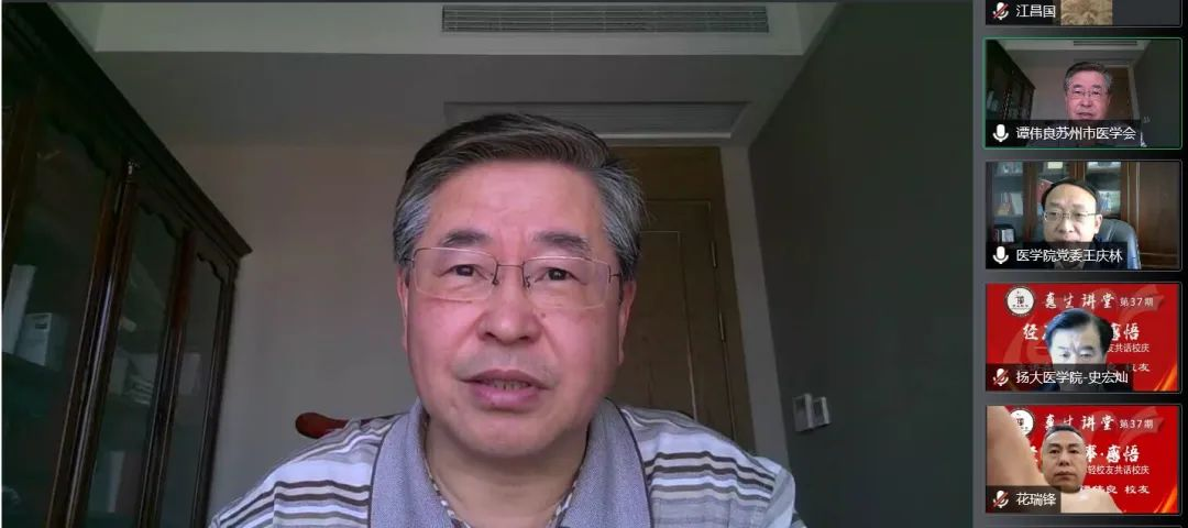5月14号上午9时,医学院第37期惠生讲堂在线上开讲,医学院1981级校友、博士生导师,苏州市医学会会长,苏州市二级巡视员,苏州大学健康中国研究院院长谭伟良应邀作客本次讲座。讲座由医学院党委书记王庆林主持,医学院院长史宏灿,院党委副书记花瑞锋,教师代表和学生参与讲座。讲座通过线上腾讯会议的形式进行直播,同时在“扬州大学医学院”官方B站平台进行联动播出。