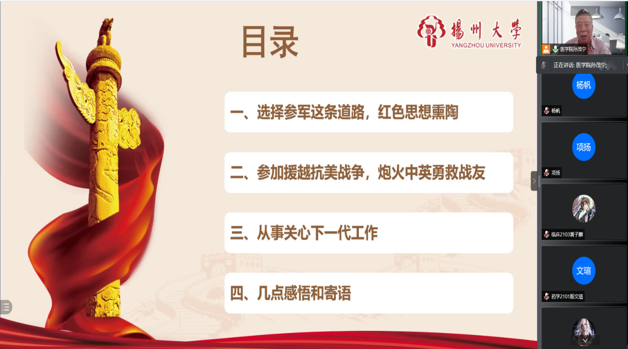 10月16日,校关工委副秘书长、办公室副主任刘方云老师为我院2021级新生带来题为“军队大熔炉里成长,炮火中英勇救战友”的线上讲座,800余名2021级新生聆听讲座。