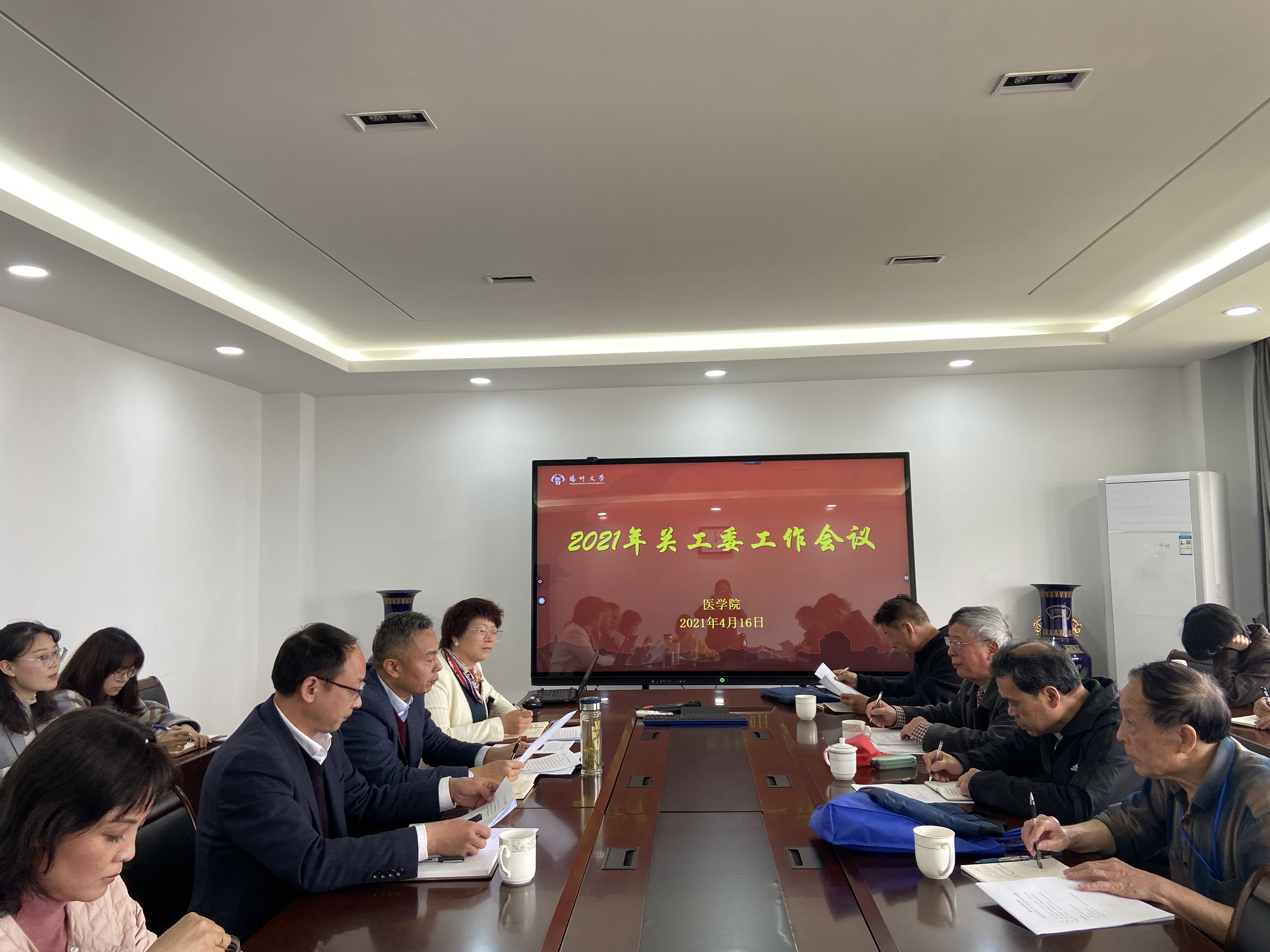 4月16日上午十点,医学院在江阳路北校区19号楼808会议室召开了2021年关工委工作会议。校关工委办公室副主任刘方云,院关工委名誉主任、院党委书记王庆林,院关工委主任、党委副书记花瑞锋、淮海路校区离退办唐尧、孙国祥、孙保生、陈扬,院办公室主任王芬、院团委书记许金鑫及各系辅导员参加了会议。会议由花瑞锋主任主持。
