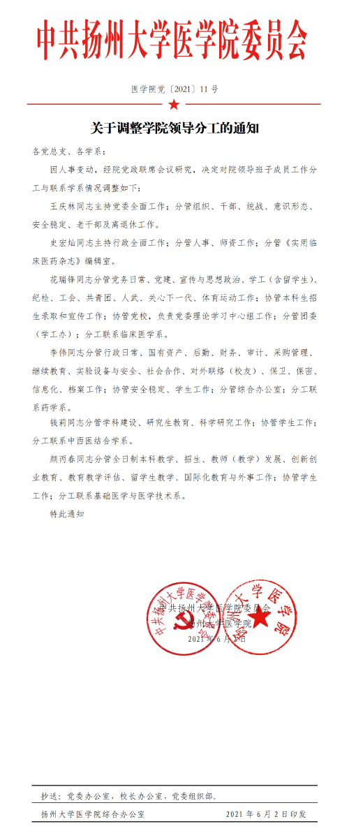 关于调整学院领导分工的通知(医学院党〔2021〕11号)