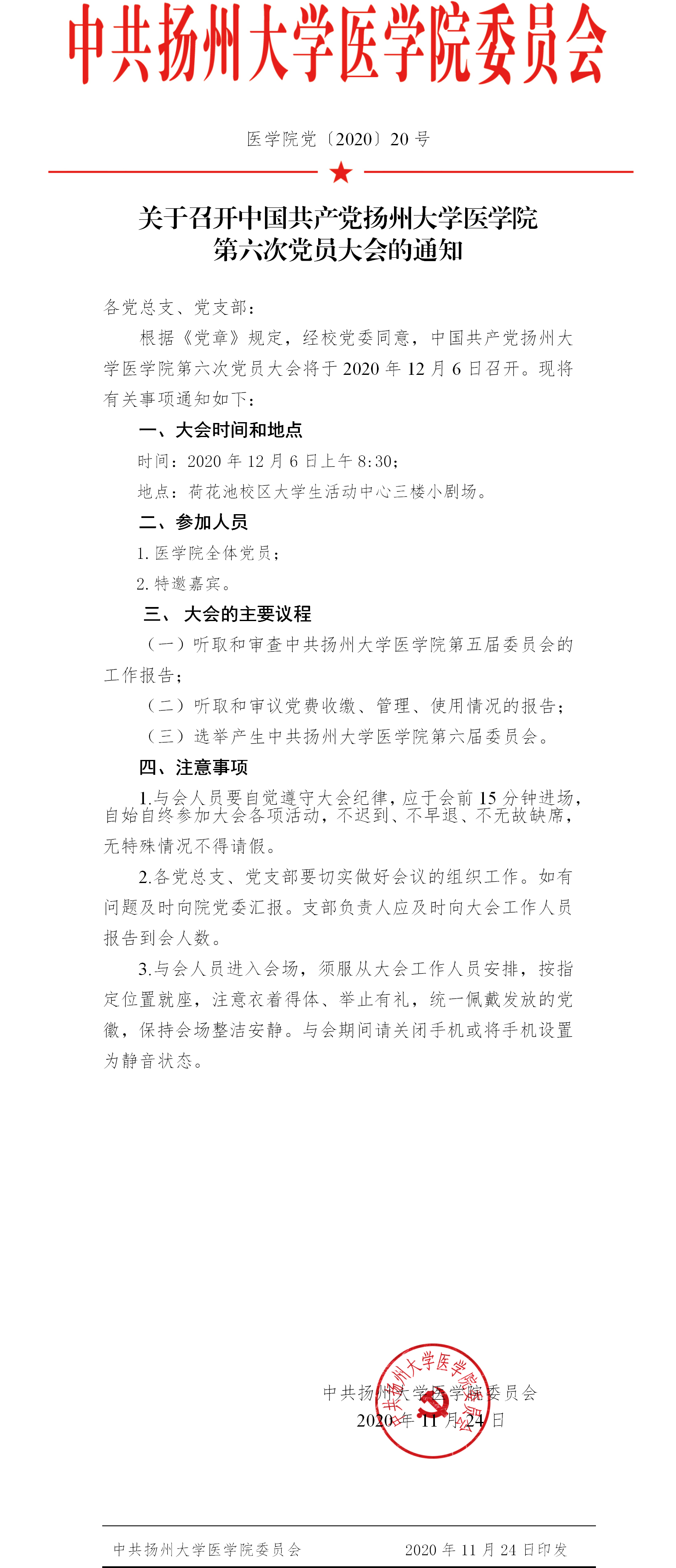 关于召开中国共产党扬州大学医学院第六次党员大会的通知