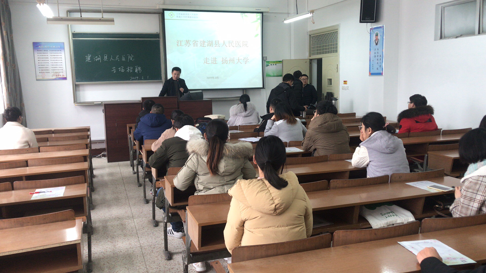 3.1日下午14点,在江阳路北校区5号楼209教室,医学院开展建湖县人民医院专场招聘会。