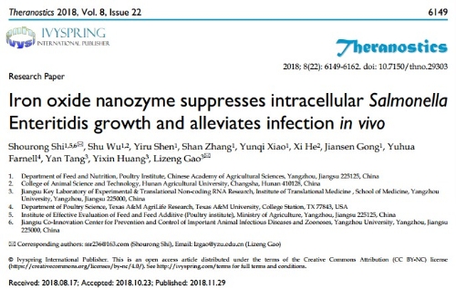 该成果由扬州大学医学院高利增教授课题组和中国农业科学院家禽研究所施寿荣副研究员课题组合作研究,发表在生物医学权威学术期刊《Theranostics》(IF: 8.537)上,题目为“Iron oxide nanozyme suppresses intracellular Salmonella Enteritidis growth and alleviates infection in vivo”,中国农业科学院家禽研究所的施寿荣副研究员和扬州大学医学院的高利增教授为该文章的共同通讯作者。该文章还被该杂志选为当期的内封面文章。