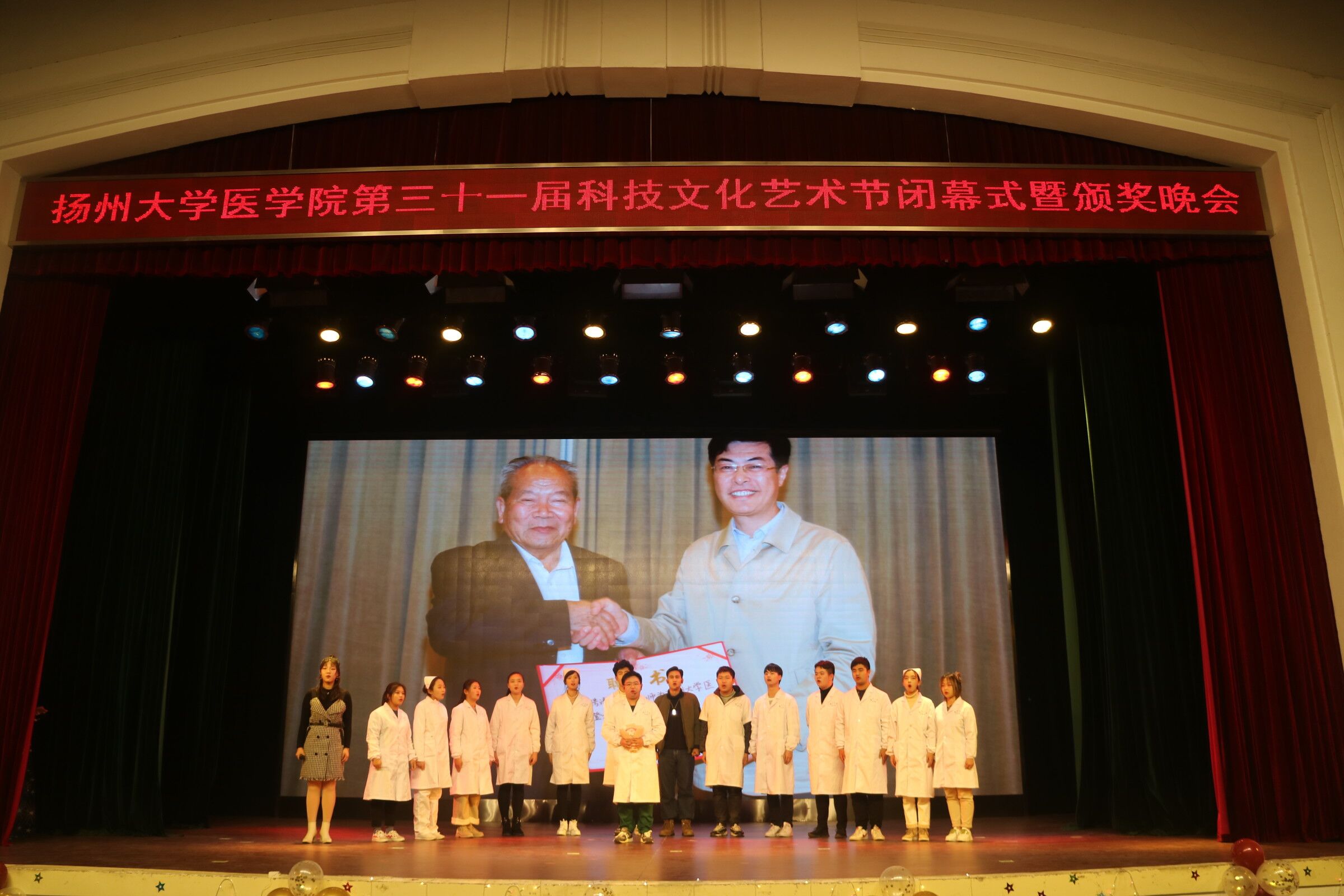 医心筑梦,致敬青春。12月11日,医学院在文汇路大礼堂隆重开展了第31届科技文化节闭幕式暨颁奖晚会。出席本次活动的嘉宾有校团委书记施林峰老师,校党委宣传部副部长吴锡平老师,学生工作部副部长、学工处副处长侯燕老师,校研究生工作部副部长姚丰华老师,校人武部副部长、保卫处副处长周佳正老师,校关心下一代工作委员会副秘书长、办公室副主任刘云方老师,院党委书记徐蕾老师,院党委副书记花瑞锋老师,副院长郑英老师、李伟老师,以及强怀娣奖助学金冠名者、我院退休教师强怀娣老师。