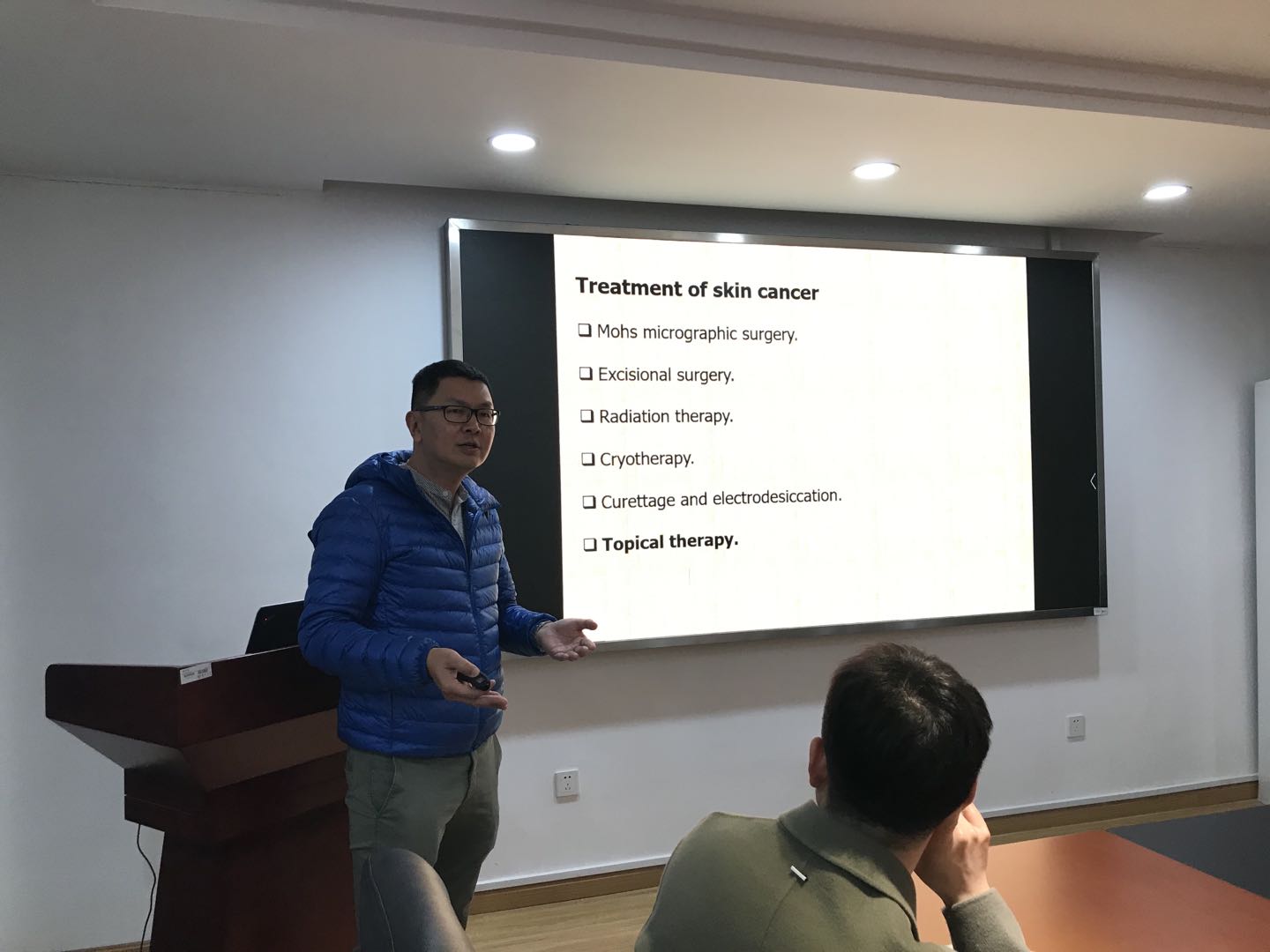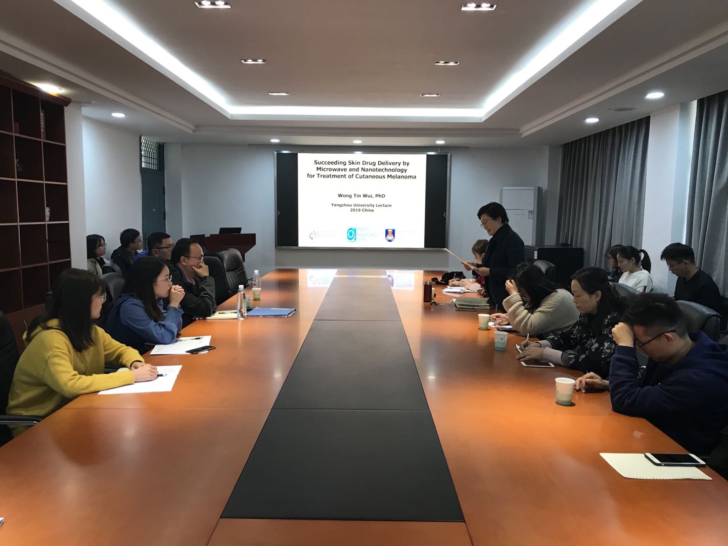 王善尉教授的研究领域主要集中在口服、经皮和肺部药物输送的纳米颗粒/支架设计上。此次报告王善尉教授重点介绍了微波联合纳米技术在药物传递及黑色素瘤治疗方面的应用。报告中,王善尉教授就微波的功率及时间对表皮细胞状态的影响、药物释放速率及其在皮肤中的穿透深度展开了详细阐述,并介绍了他开始研究微波治疗的起因及进展情况。报告会内容丰富新颖,给老师和研究生很大的启发。会后,师生与王教授针对具体研究内容进行了热烈讨论,参与讨论的老师和同学们受益颇多,深刻体会到了科研的魅力。