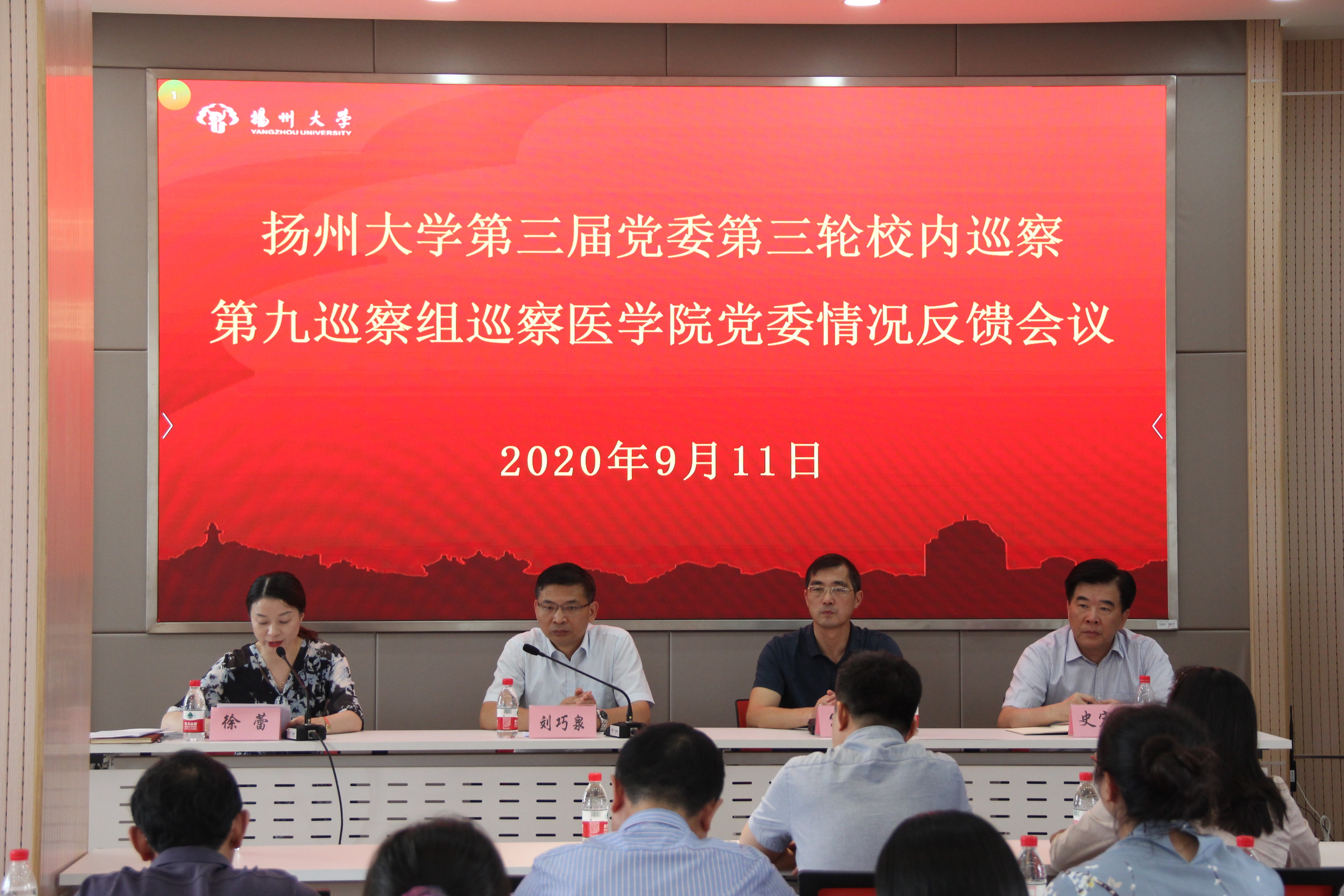 2020年9月11日下午,扬州大学第三届党委第九巡察组巡察医学院党委情况反馈会议在路北校区19号楼9楼报告厅举行。会议由院党委书记徐蕾主持。