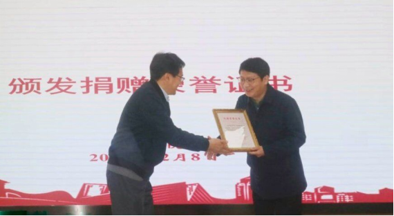 校对外联络办公室副主任、教育发展基金会副秘书长王晖向扬中市人民医院纪委书记杨彬颁发了捐赠荣誉证书。