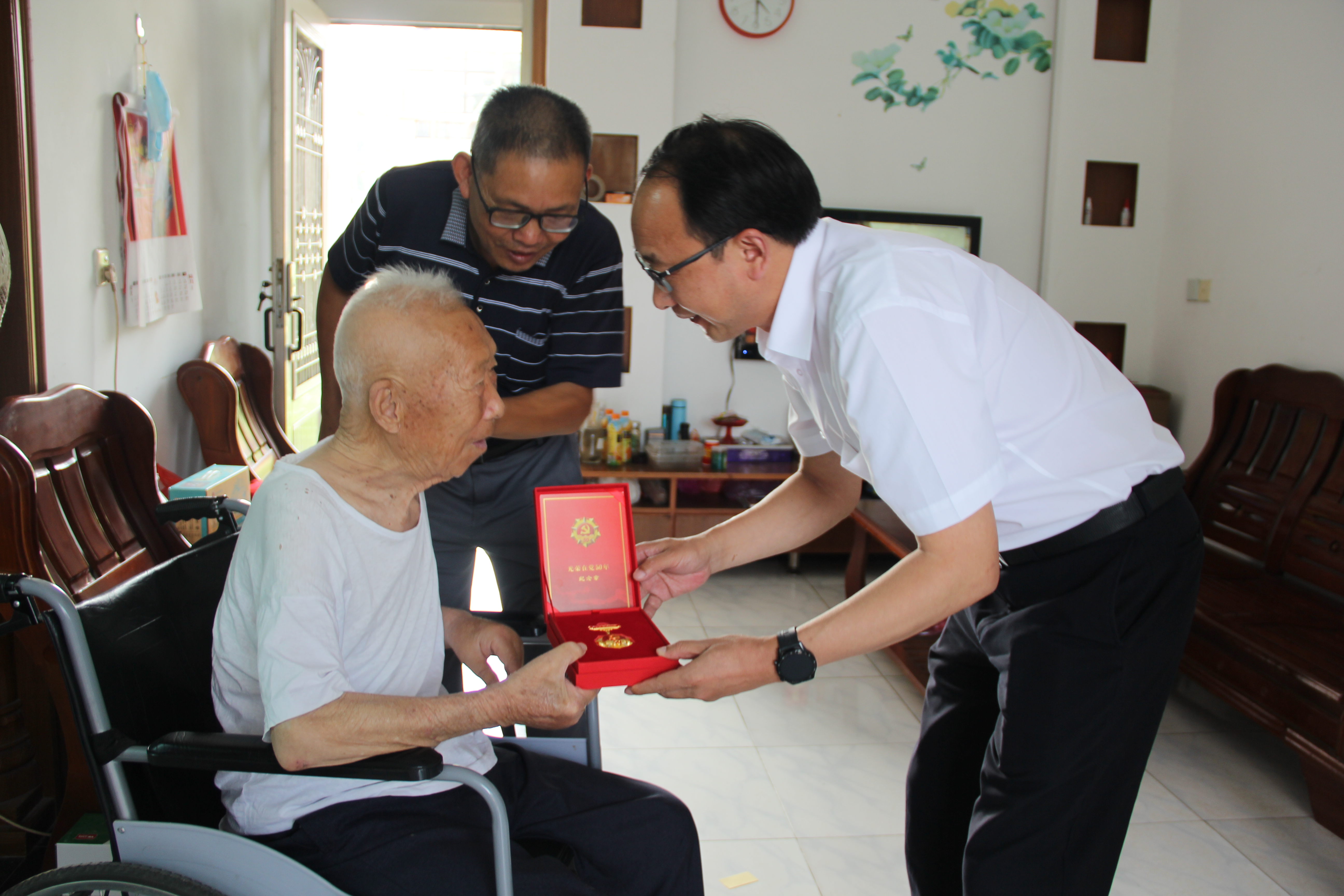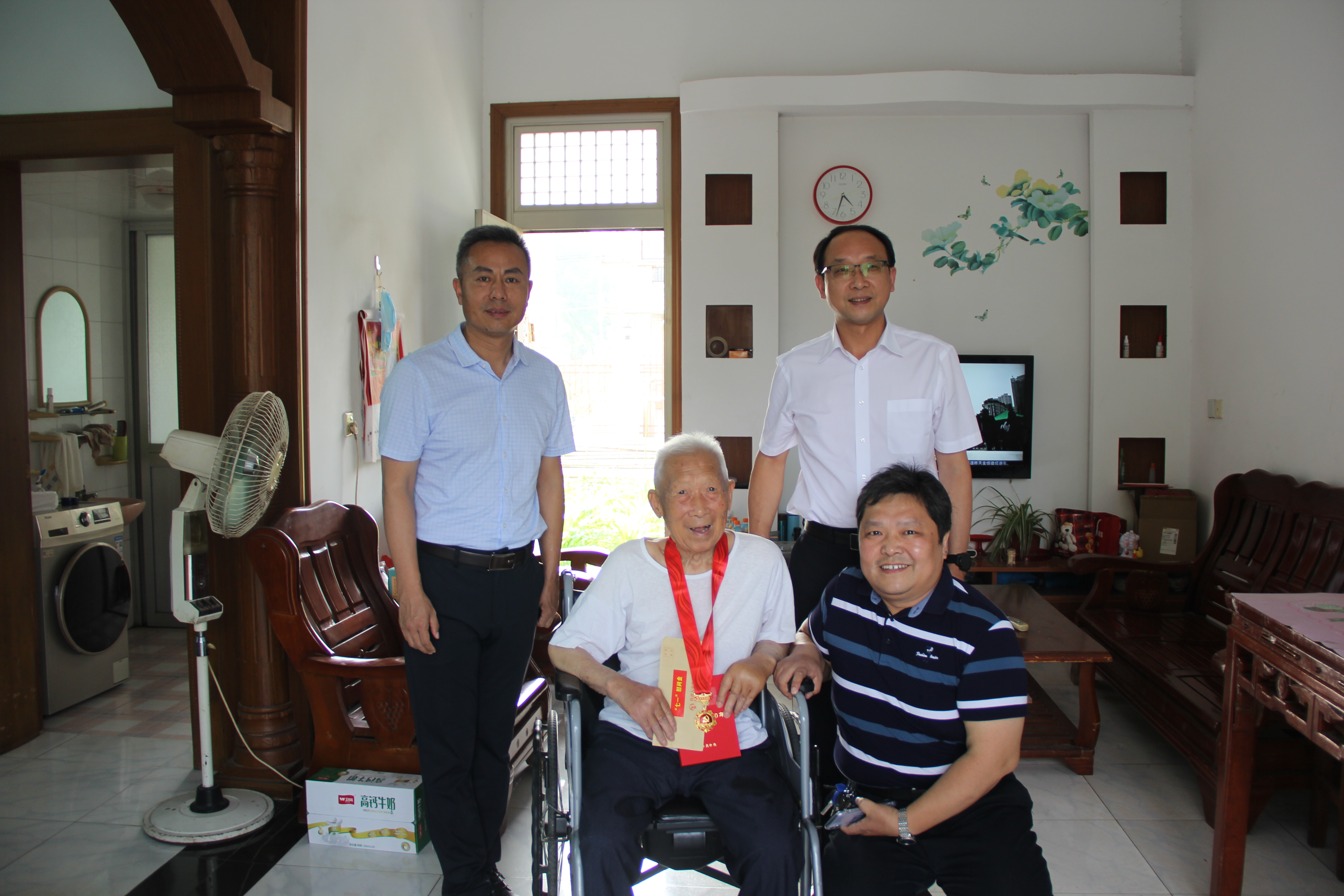 7月1日下午,院党委书记王庆林、副书记花瑞锋和解剖教研室孙庆荣老师来到扬州新坝,看望了原解剖教研室的於朝荣老师。王书记仔细询问老人的身体、生活、家庭等情况,为於老师佩戴了荣誉勋章,并送上了鲜花和慰问金。