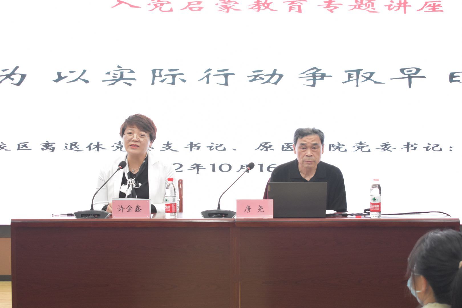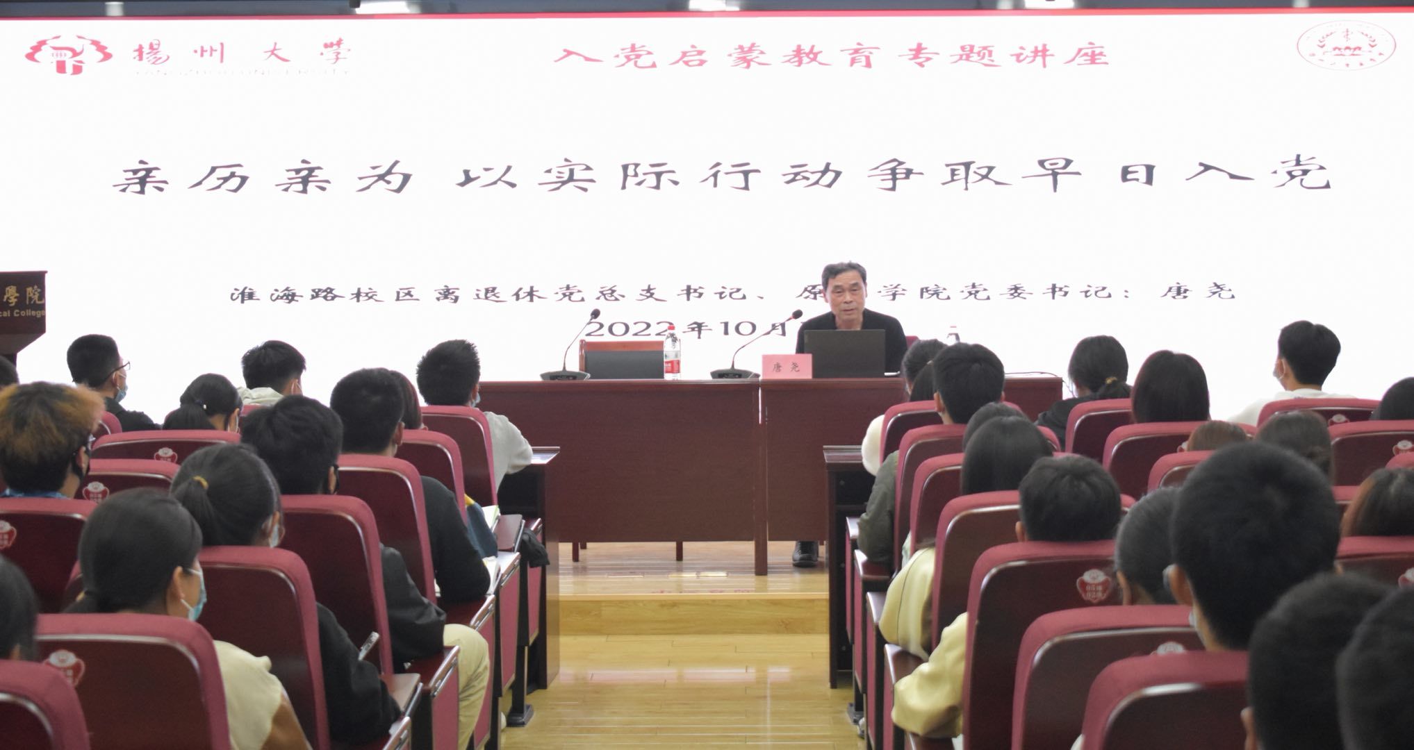 10月16日,党的二十大胜利召开,习近平总书记所作的报告让每位学子无比振奋,对青年的寄语更让大家倍感力量。青年兴,则国兴。为了进一步让医学院的大一新生体悟中国共产党的初心使命,引导大家积极向党组织靠拢,为同学们指明前进方向,10月16日晚,我院在路北校区5号楼401举办了一场以“亲历亲为,以实际行动争取早日入党”为主题的入党启蒙讲座。本次讲座以线上线下相结合的方式,邀请了淮海路校区离退休党总支书记、原医学院党委书记唐尧老师担任主讲嘉宾,院团委书记许金鑫老师主持。