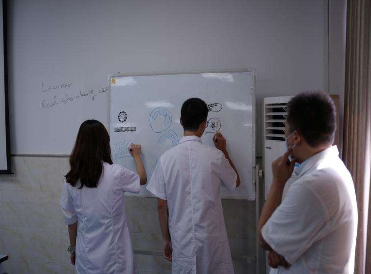 为进一步激发新生对医学专业课的浓厚兴趣,岳老师组织同学们进行“你画我猜”的小游戏,设置有相应的奖品。期间,岳老师对同学们画图中存在的问题进行了纠正,号召有兴趣和能力的同学们积极参加学术竞赛活动。寓教于乐,在实践教学中渗透医学科研思维的培养。