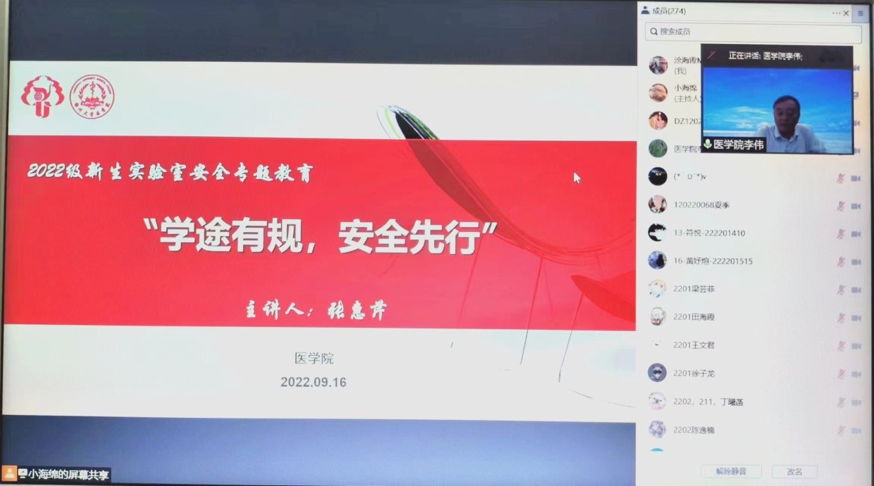 为切实提高我院学生的安全意识和安全素养,9月16日下午,我院特邀扬州大学实验室与设备管理处副处长张惠芹老师作“学途有规,安全先行”讲座。本次讲座采用线上宣讲的形式,由我院副院长李伟主持,我院2022级新生约300人参加讲座。