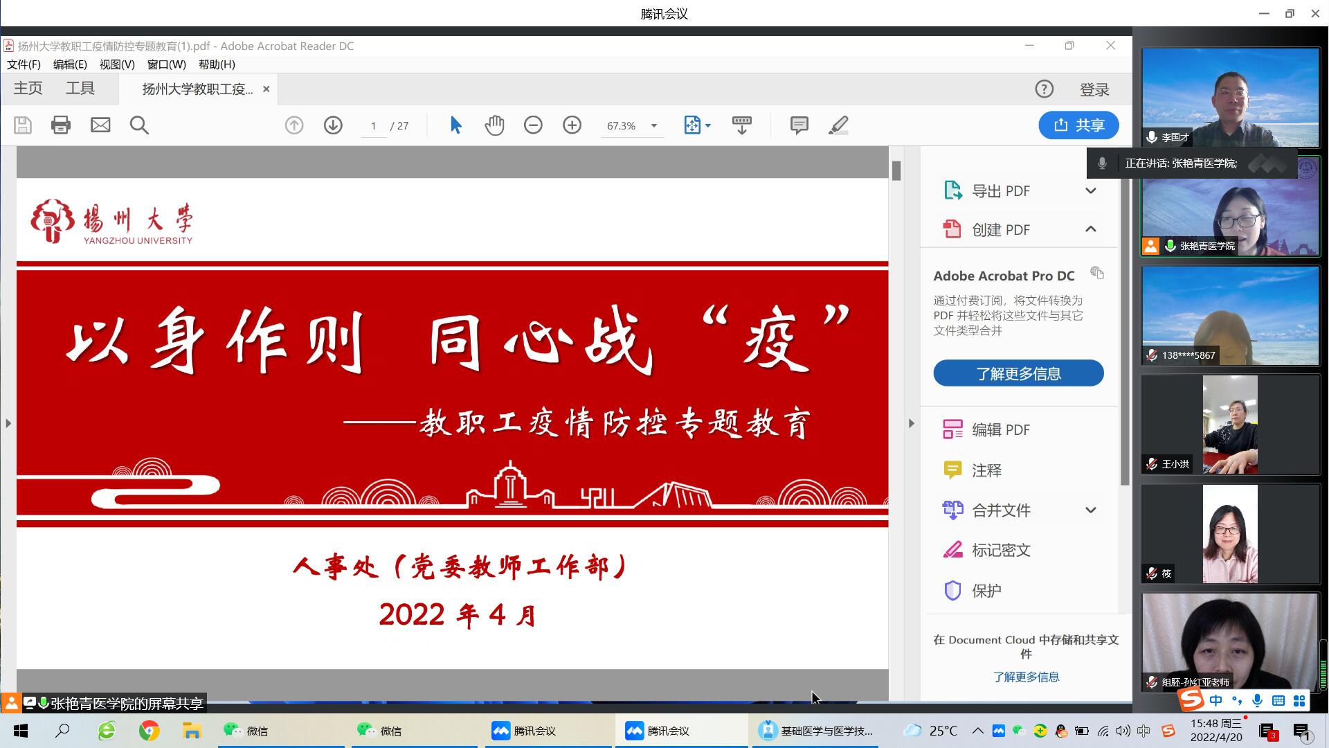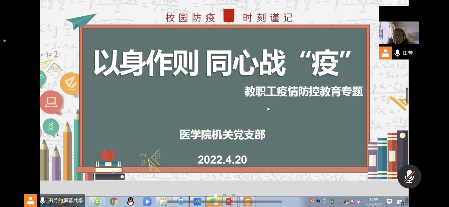 为进一步贯彻落实全国教育系统疫情防控工作视频培训会、江苏省高校疫情防控工作调度会和学校疫情防控工作线上点调会会议精神,压紧压实教职工疫情防控主体责任,扎实做好校园封控管理期间教职工疫情防控工作,医学院各基层党支部围绕“以身作则,同心战‘疫’”主题,集中开展了线上教育活动。