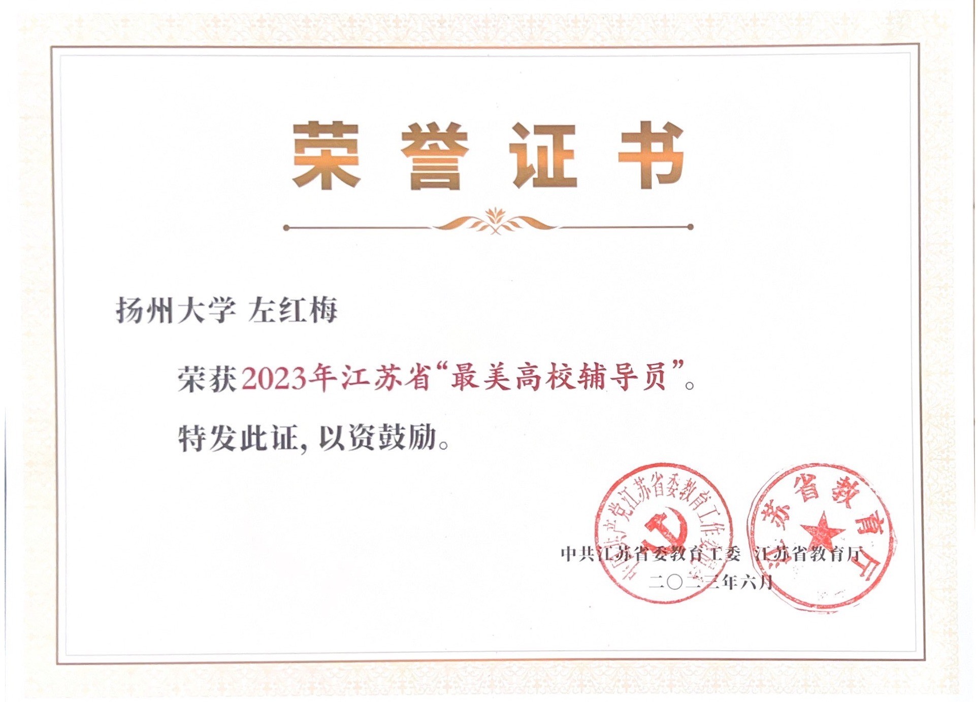 6月18日下午,由省委教育工委、省教育厅主办的第十三届江苏省“大学生年度人物和高校辅导员年度人物”暨2023年“最美大学生”“最美高校辅导员”颁奖典礼在南京农业大学隆重举行,我院辅导员左红梅老师获评2023年江苏省“最美高校辅导员”。
