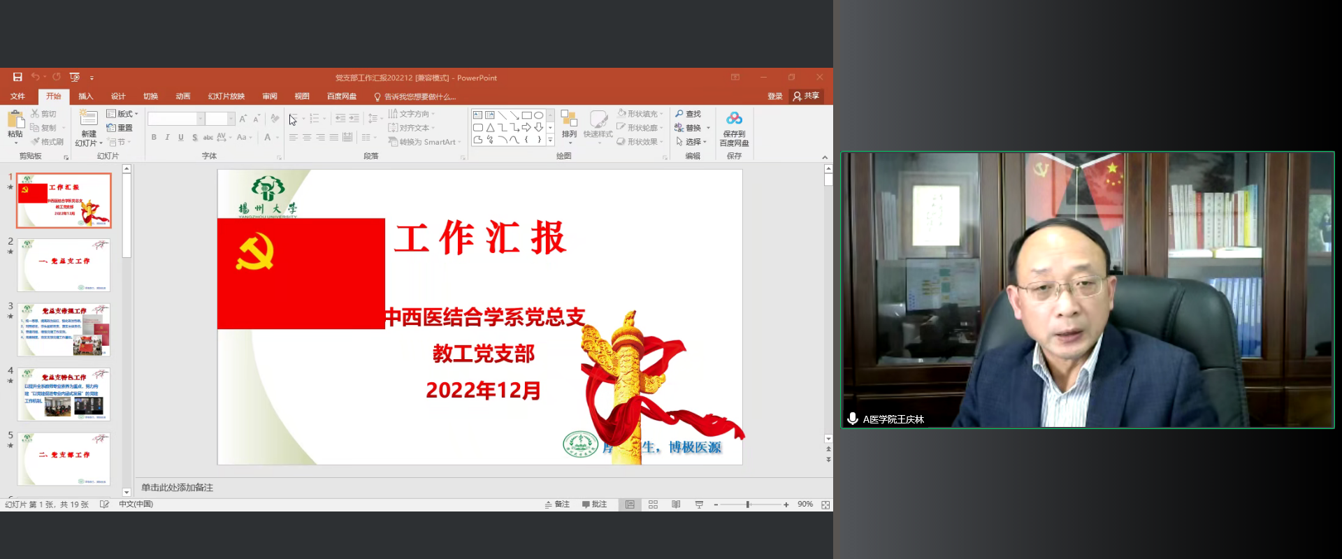 王庆林对本次述职评议进行总结,他表示,本次述职评议会是一次检验会,也是一次交流研讨会,更是一次自我加压的动员会。在2022年,各党总支、党支部克服疫情困难,以高质量党建引领高质量发展,在人才培养、科研创新、教学改革等工作上取得了很多成绩,但对照基层党支部建设的要求还存在很多不足。他希望,在2023年,各党总支、党支部要扛稳政治责任,将党的领导落实到各个环节;要坚持“七个有力”,大抓基层建设,不断提升党支部工作质效;要对标“六个过硬”,全面落实“一融双高”,让党建与中心工作深度融合,推动学院各项事业高质量发展。