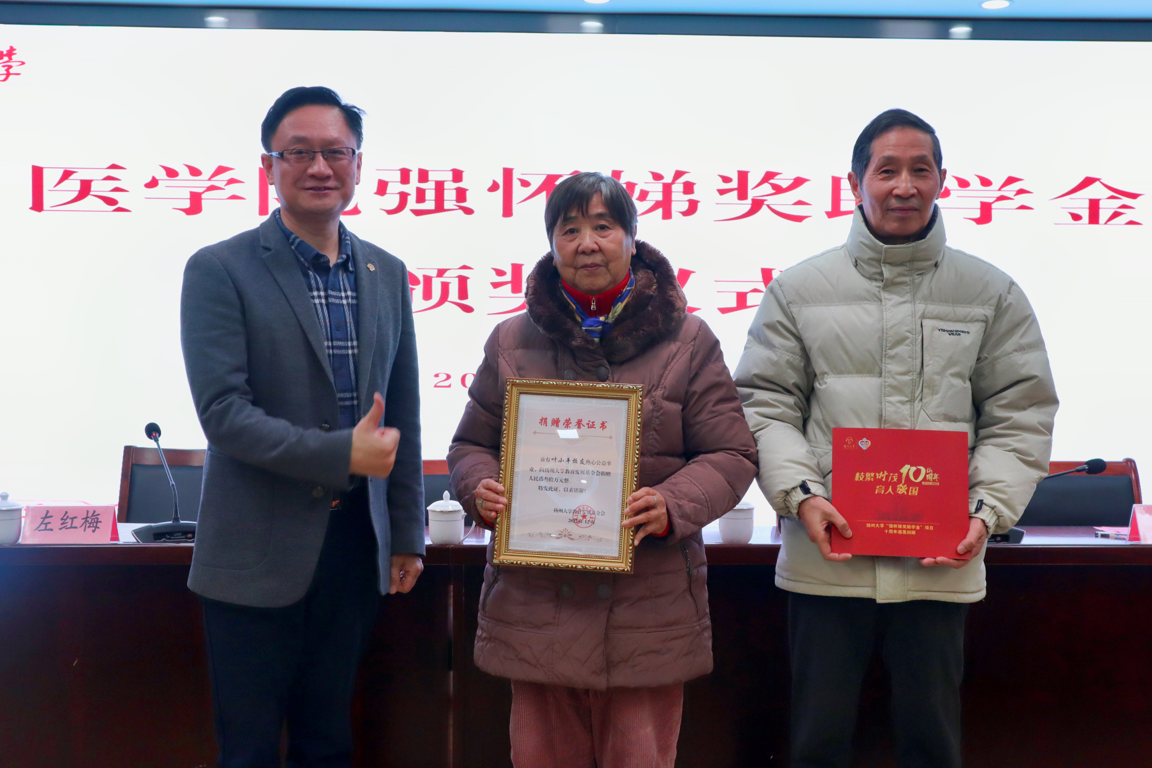 校对外联络办公室、扬州大学教育发展基金会办公室主任陈克勤老师代表扬州大学教育发展基金会向捐赠单位代表颁发了捐赠证书并赠送扬州大学“强怀娣奖助学金”项目十周年感恩回顾画册。