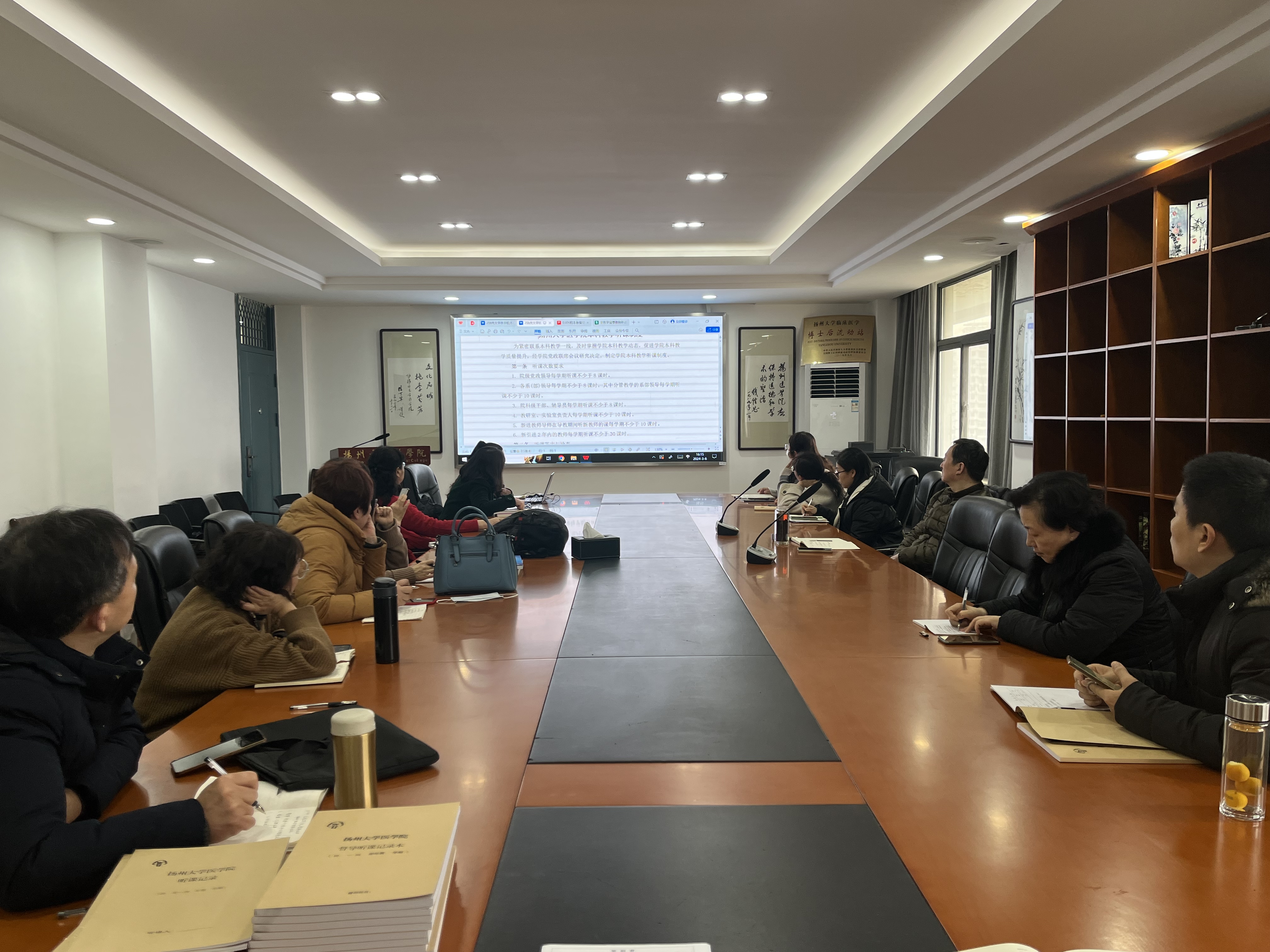 会上,教学办丁晓帆老师带领大家学习新制定的《扬州大学医学院本科教学督导工作管理办法》、《扬州大学医学院本科教学督导员工作职责》、《扬州大学医学院本科教学听课制度》等文件。