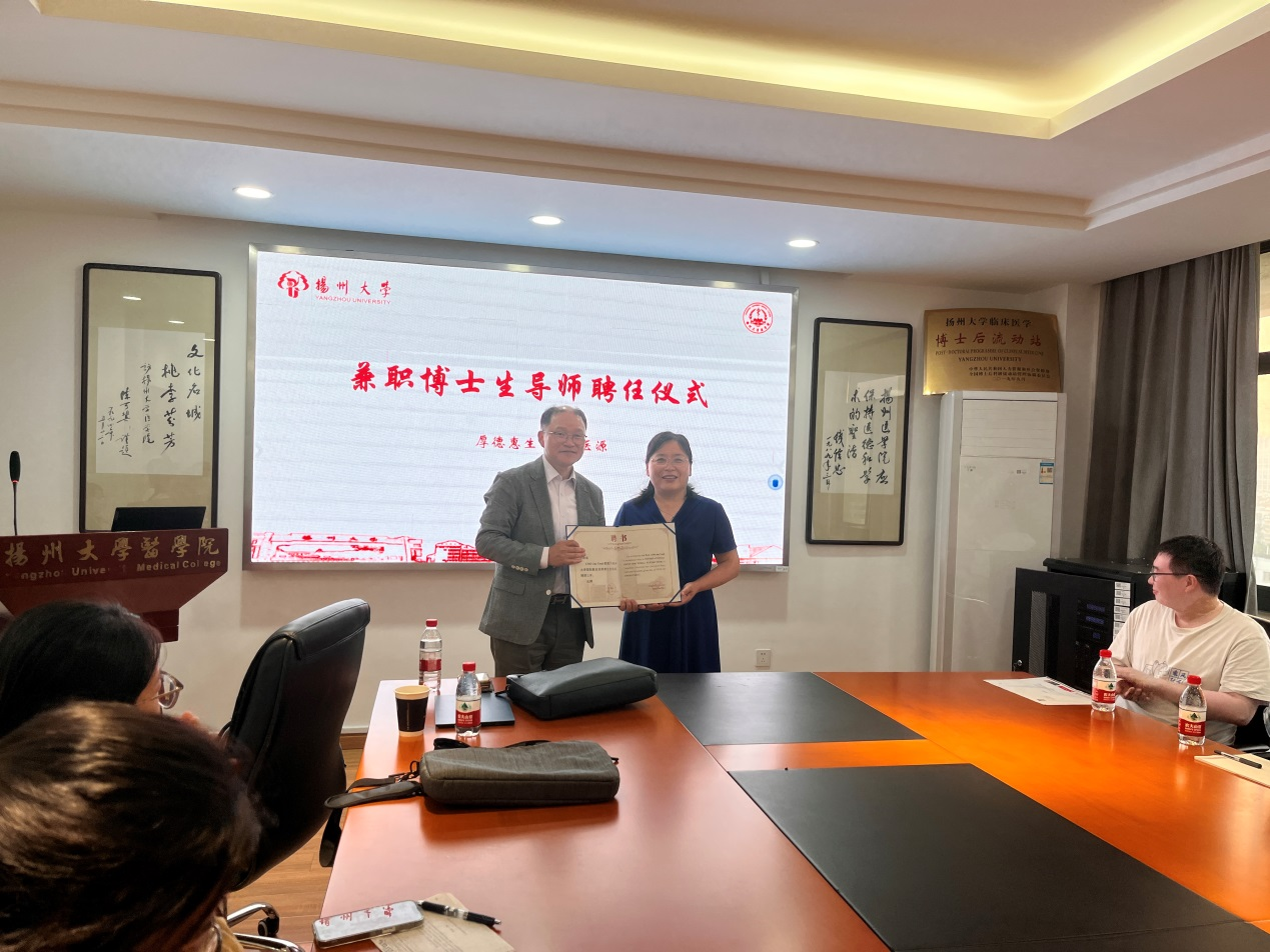 院党委副书记左红梅代表学院党委对JaeYoul Cho教授的到来表示欢迎,并为JaeYoul Cho教授颁发扬州大学国际联合培养博士生导师聘任书。她指出,希望能以此次聘任为契机,与JaeYoul Cho教授在学科建设、科学研究等方面进一步加强合作,共同培养道德高、素质好、专业强的医学人才。