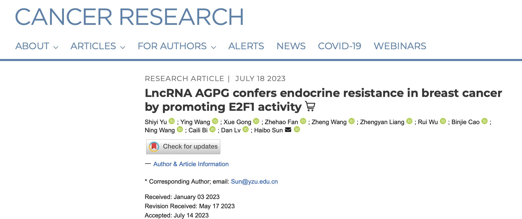 2023年7月18日,国际知名肿瘤期刊Cancer Research(影响因子11.2,1区Top)在线发表了扬州大学医学院、转化医学研究院孙海波教授团队的最新研究论文,题为“LncRNA AGPG confers endocrine resistance in breast cancer by promoting E2F1 activity”。