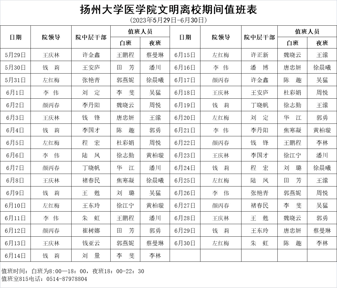 扬州大学医学院文明离校期间值班表