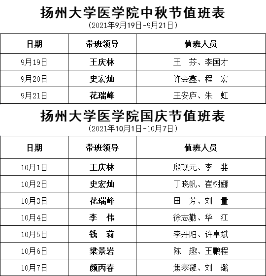 扬州大学医学院中秋节、国庆节值班表