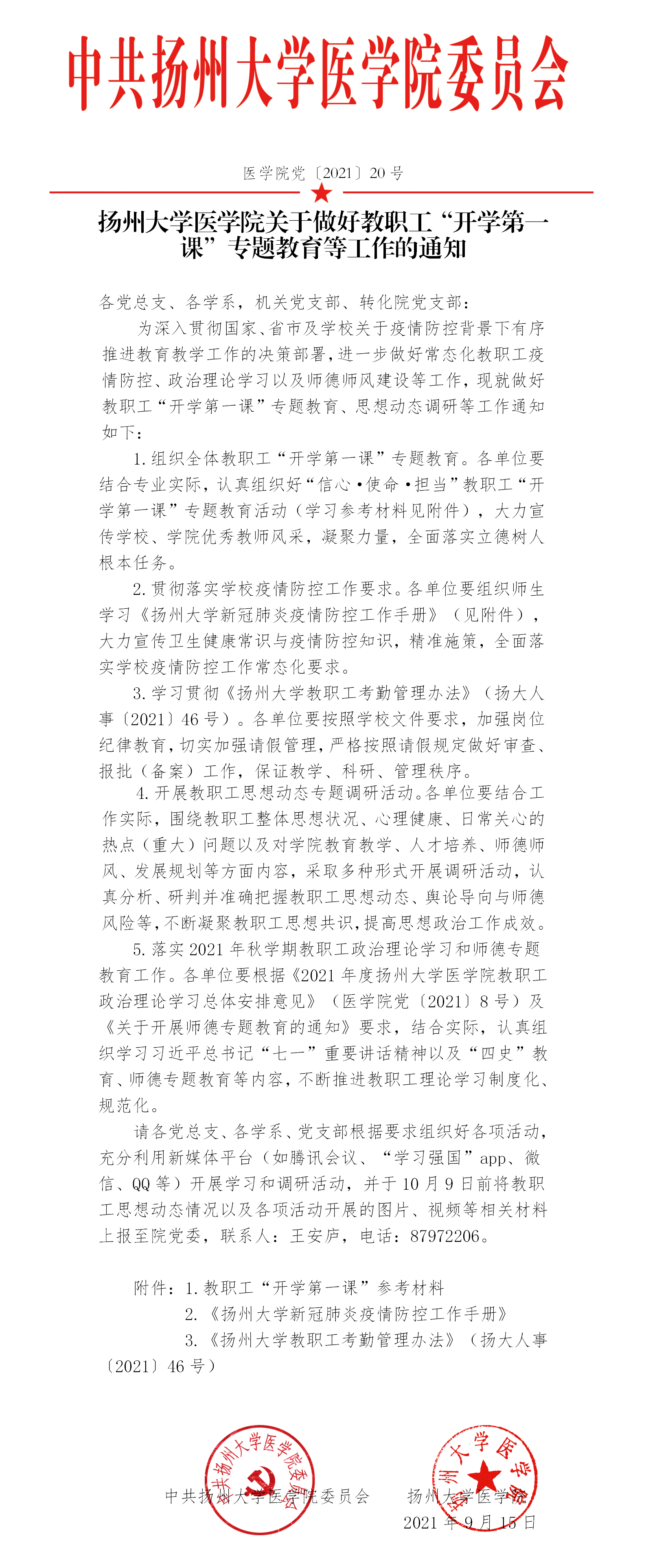 扬州大学医学院关于做好教职工“开学第一课”专题教育等工作的通知(医学院党 [2021] 20号)