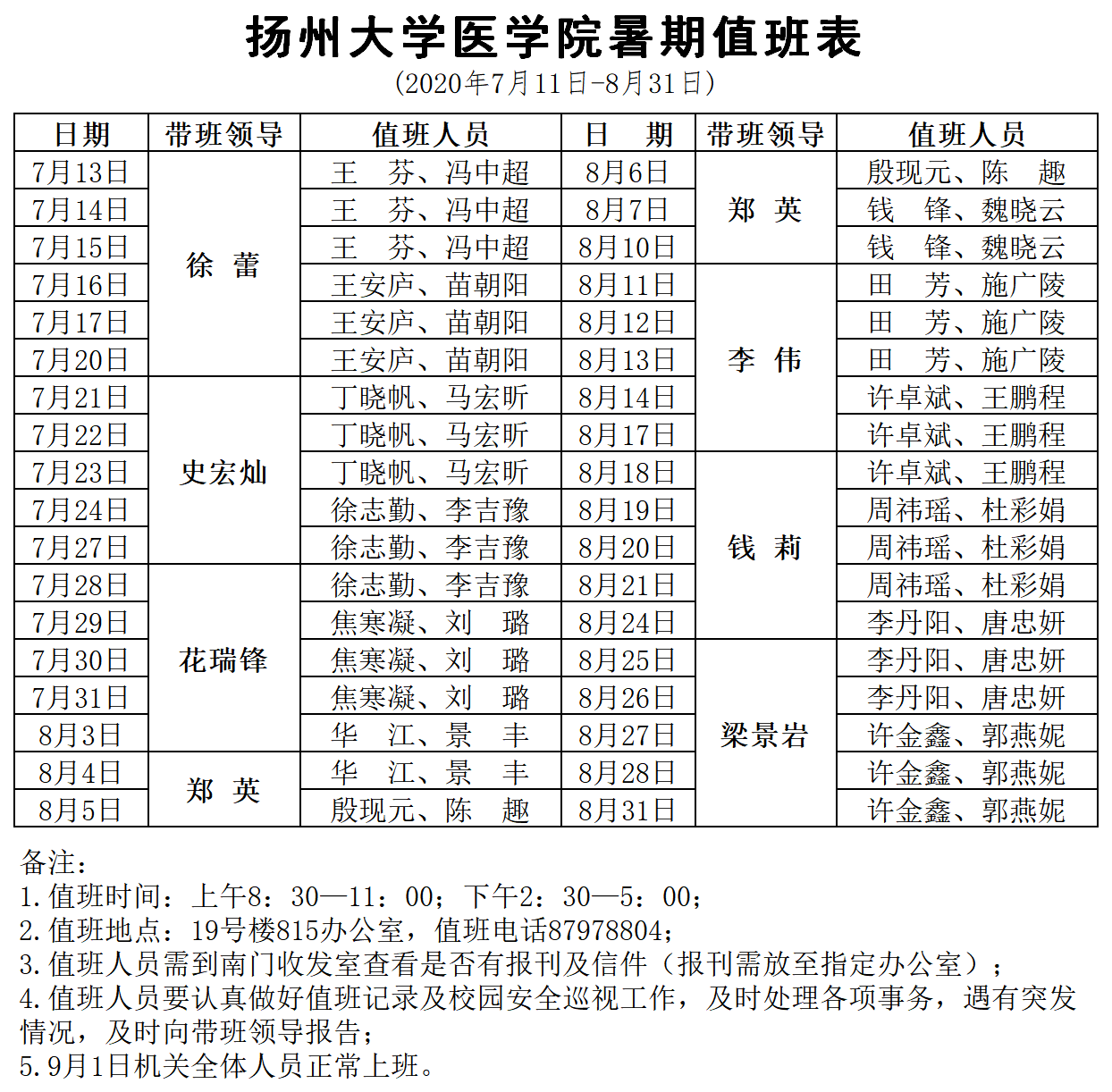 扬州大学医学院暑期值班表(7月13日-8月31日)