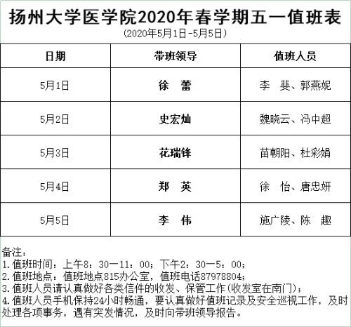 扬州大学医学院2020年春学期五一值班表(2020年5月1日-5月5日)
