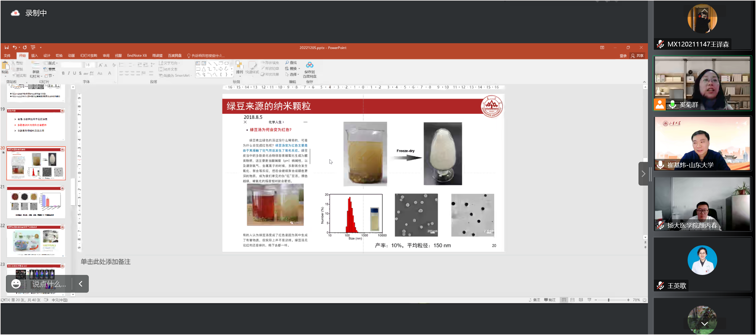 崔基炜教授主要从事胶体与界面化学和生物医学相关的交叉研究。此次报告,崔教授就金属-多酚用于表面涂层、多酚基纳米药物和疫苗的递送体系,多酚基生物医学辅料的制备及应用展开介绍。如:绿豆汤及中药小蓟来源的纳米颗粒用于药物递送。此外,崔教授还介绍了他们团队在止血和肿瘤术后治疗领域中的最新研究成果。